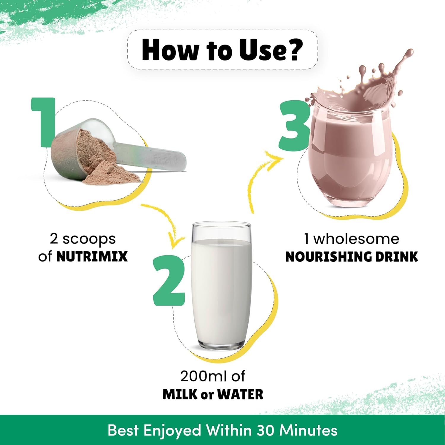 • NATURALLY SWEETENED (NO REFINED SUGAR) – Nutrimix is a perfect blend of unique organic ingredients. It is naturally sweetened with dates & jaggery, which helps detoxify the body, preventing constipation and improving digestion. It also has a higher antioxidant content than sugar or honey, making our nutrition drink tasty and healthy!